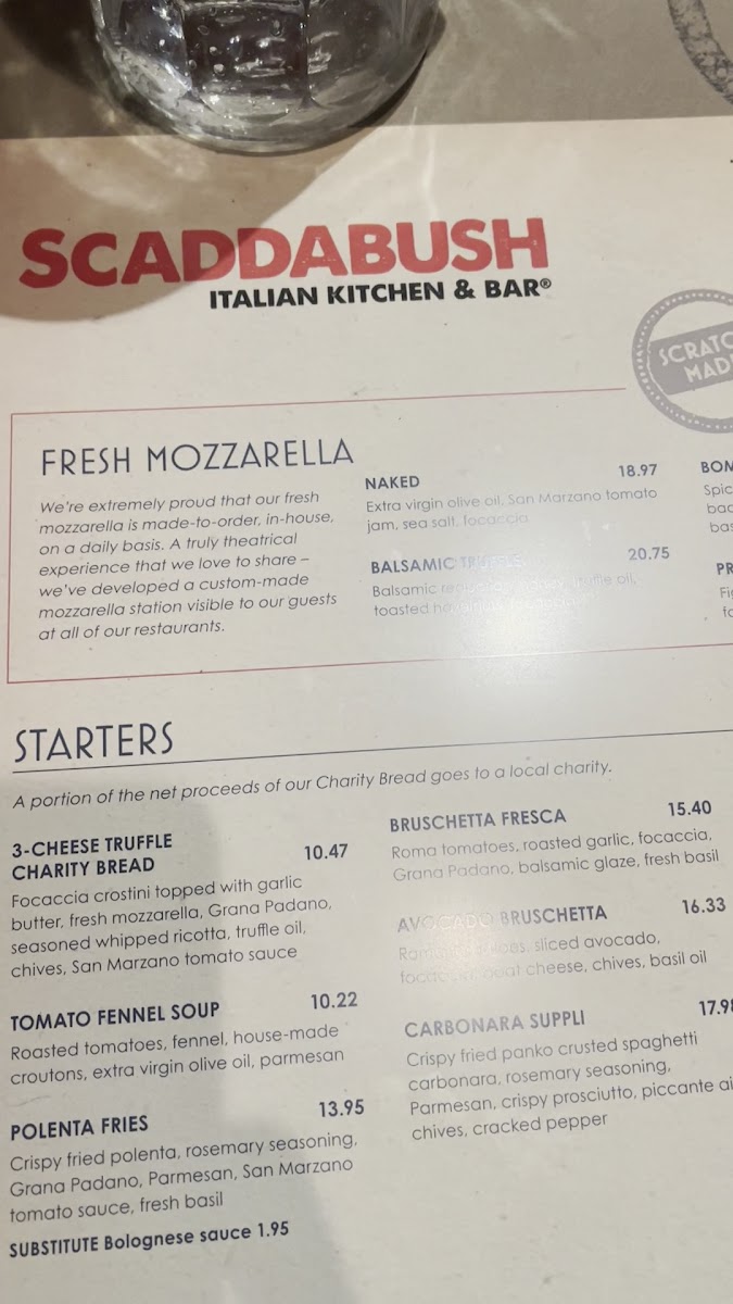 Scaddabush is synonymous with fresh, high-quality ingredients, and their menu doesn’t disappoint. Indulge in the Fresh Mozzarella, drizzled with naked extra virgin olive oil and paired with a delightful San Marzano tomato jam. Or, dive into the Bomba, a spicy tomato bacon ragu served with warm focaccia, each dish showcasing the kitchen's commitment to authenticity and freshness. The focus on traditional Italian flavors is evident, providing a delightful journey through each bite.